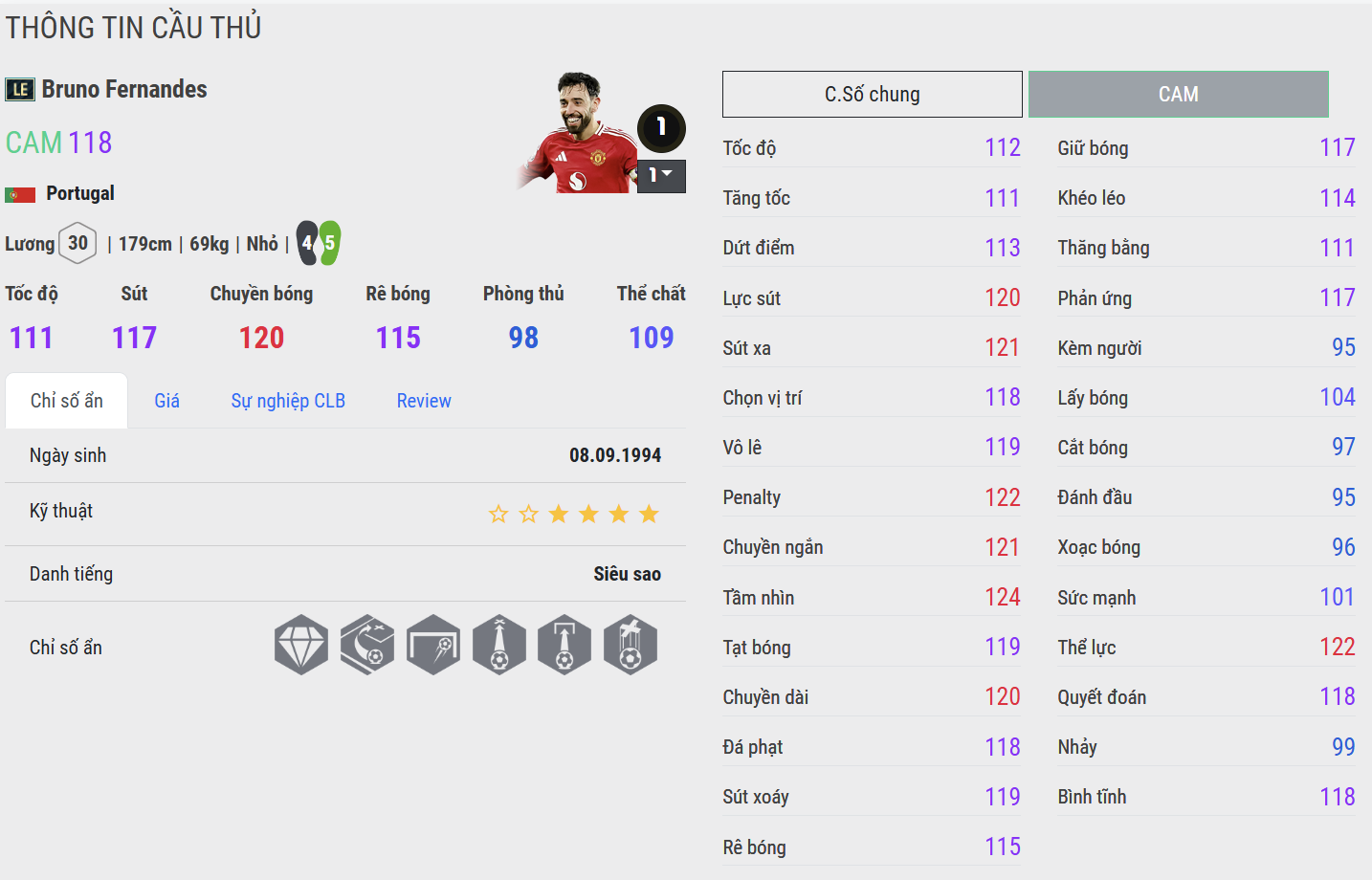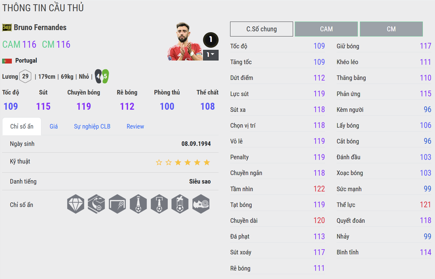 Bruno Fernandes 24EP là phiên bản nâng cấp rõ rệt về độ ổn định. Khả năng chuyền bóng, sút xa và tham gia tấn công của Bruno trở nên hiệu quả hơn, phù hợp với nhiều lối chơi khác nhau.