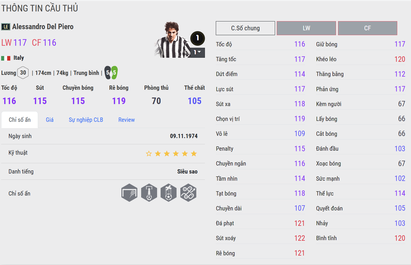 Alessandro Del Piero LE mang đến sự cân bằng giữa kỹ thuật và dứt điểm. Những cú cứa lòng đặc trưng cùng khả năng di chuyển thông minh giúp Del Piero rất nguy hiểm ở khu vực rìa vòng cấm.
