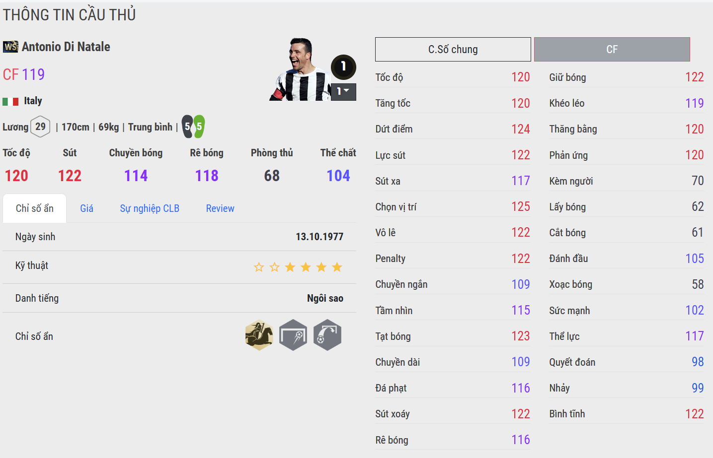 Antonio Di Natale WS là mẫu hộ công thiên về dứt điểm. Anh di chuyển linh hoạt, xử lý nhanh và có khả năng kết thúc rất gọn gàng. Trong thực chiến, Di Natale phù hợp với lối chơi tốc độ và phản công.