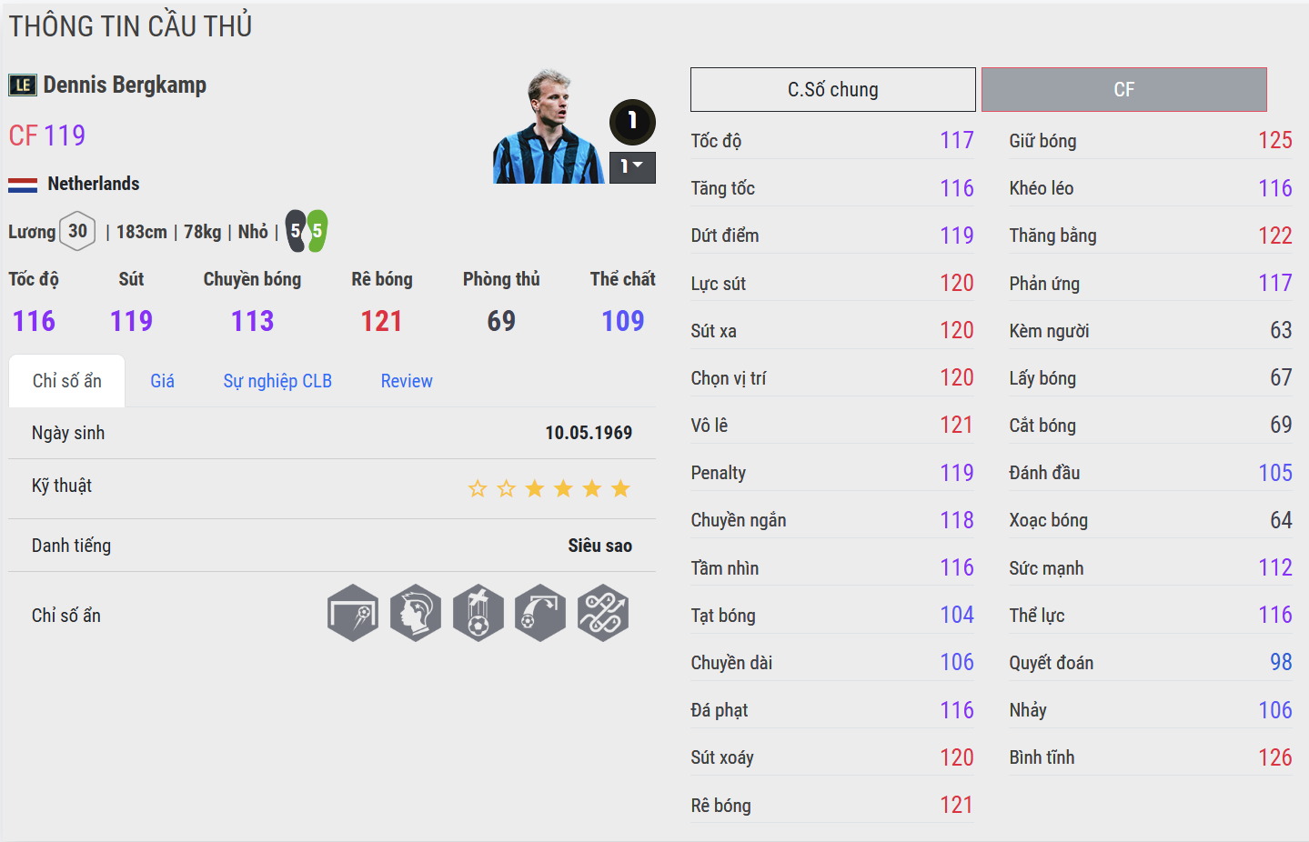 Dennis Bergkamp LE là hiện thân của sự tinh tế và nghệ thuật. Những pha chạm bóng mềm mại, xử lý gọn gàng và các đường chuyền mang tính sáng tạo cao khiến anh trở thành “người kể chuyện” trong lối chơi. Trong thực chiến, Bergkamp phát huy tối đa khi chơi phía sau tiền đạo, làm cầu nối giữa tuyến giữa và hàng công.
