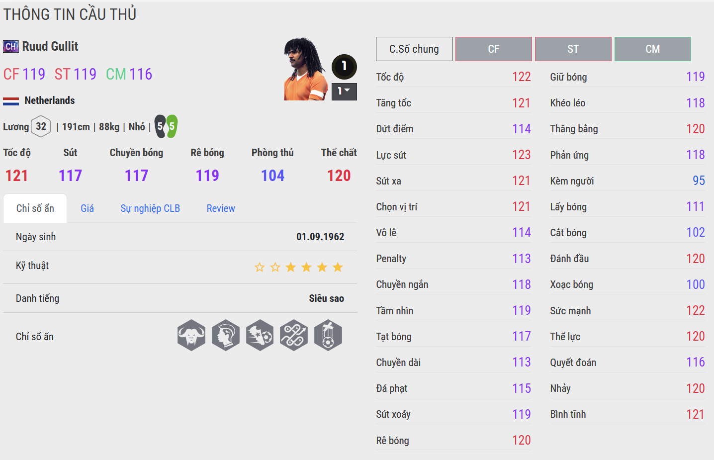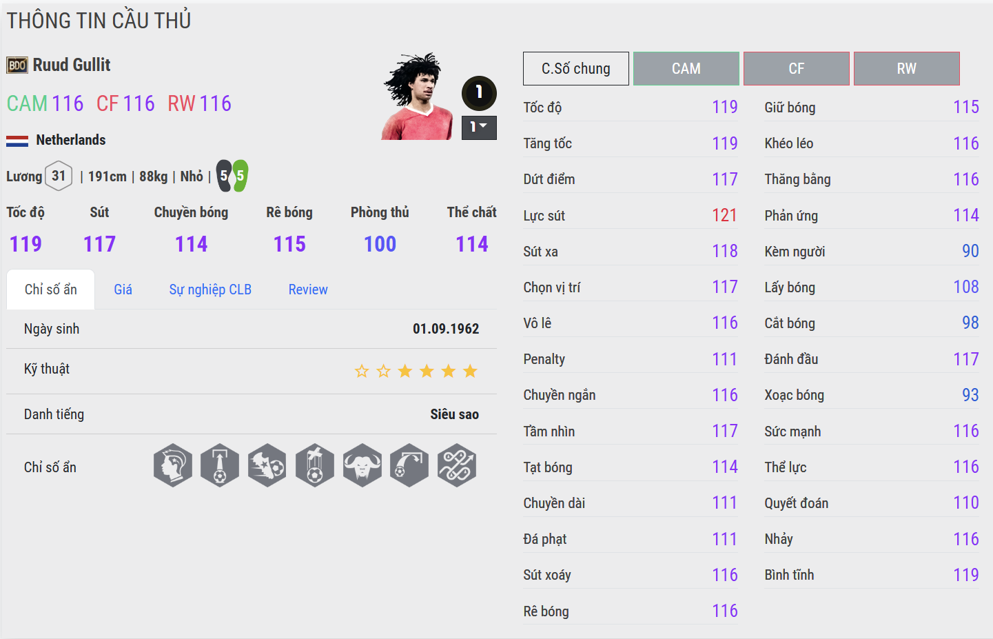 Ruud Gullit CH là phiên bản hoàn hảo nhất cho vị trí CAM của Hà Lan. Anh hội tụ đầy đủ mọi yếu tố: thể chất, kỹ thuật, khả năng công thủ toàn diện và tầm ảnh hưởng lớn lên trận đấu. Trong thực chiến, Gullit CH không chỉ là một tiền vệ công mà còn là “trái tim” của đội hình – nơi mọi đường bóng đều có thể đi qua và tạo ra khác biệt.