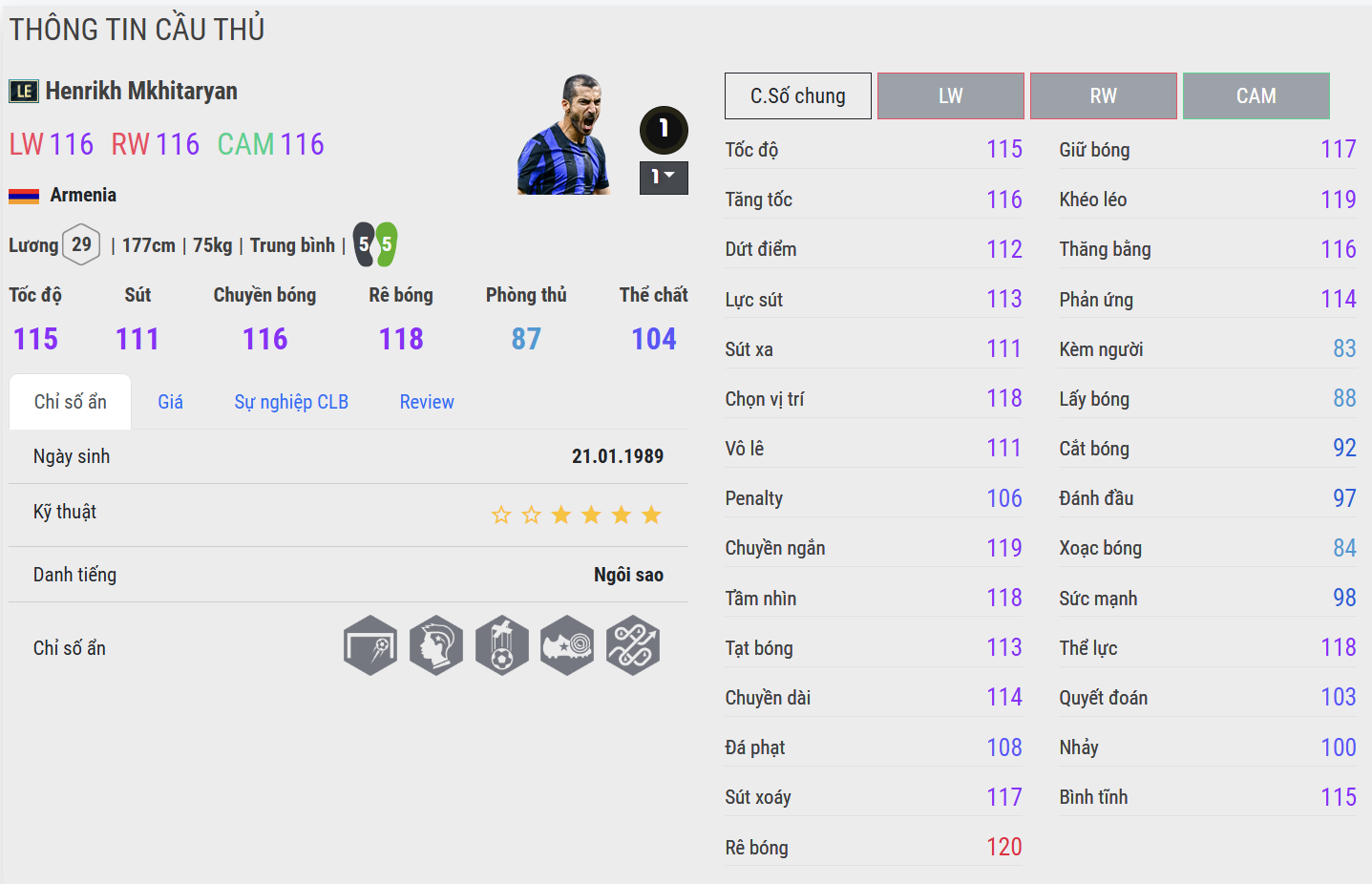 Henrikh Mkhitaryan LE là mẫu tiền vệ tấn công cân bằng, có thể đảm nhận tốt vai trò kết nối giữa tuyến giữa và hàng công. Anh sở hữu khả năng chuyền bóng ổn định, di chuyển thông minh và tham gia hỗ trợ tấn công khá hiệu quả. Trong thực chiến, Mkhitaryan mang lại cảm giác chơi mượt và phù hợp với lối đá kiểm soát.