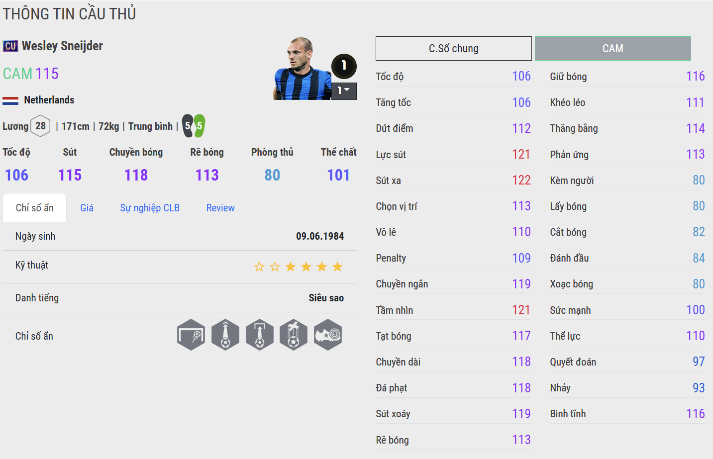 Wesley Sneijder CU là một trong những CAM đúng nghĩa với khả năng chuyền bóng và dứt điểm cực kỳ ấn tượng. Sneijder có thể tung ra những đường chọc khe sắc bén hoặc những cú sút xa đầy uy lực. Trong thực chiến, anh đóng vai trò nhạc trưởng, giúp mở ra nhiều cơ hội rõ ràng cho hàng công.