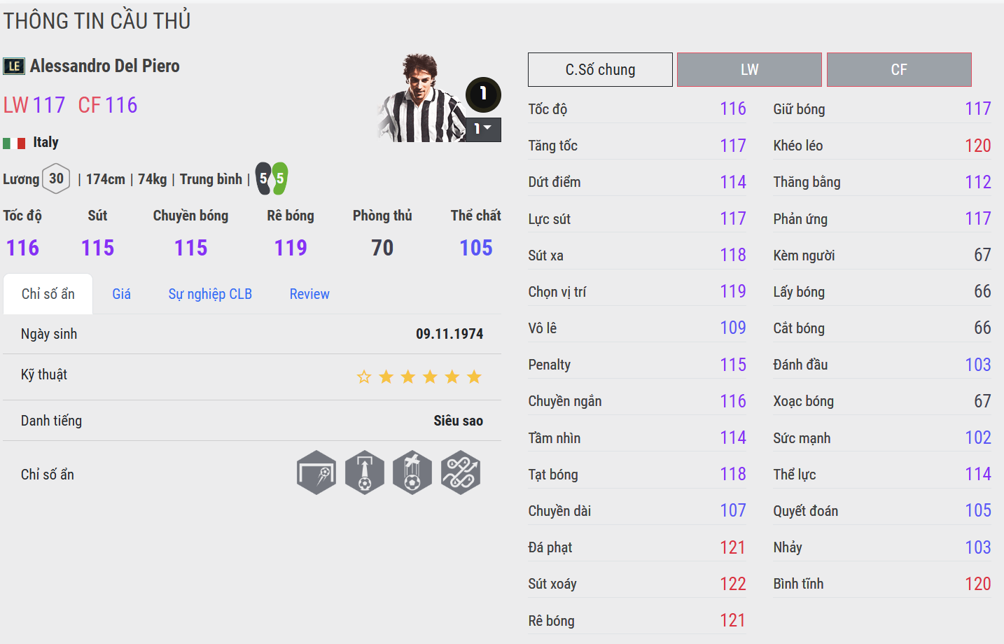 Alessandro Del Piero LE mang đến hình ảnh quen thuộc của một hộ công giàu kỹ thuật và khả năng dứt điểm tinh tế. Del Piero xử lý bóng mềm mại, xoay trở khá linh hoạt trong phạm vi hẹp và có thể tung ra những cú sút có độ chính xác cao. Trong thực chiến, anh phát huy hiệu quả tốt khi hoạt động phía sau tiền đạo cắm và tham gia vào các tình huống phối hợp tấn công.