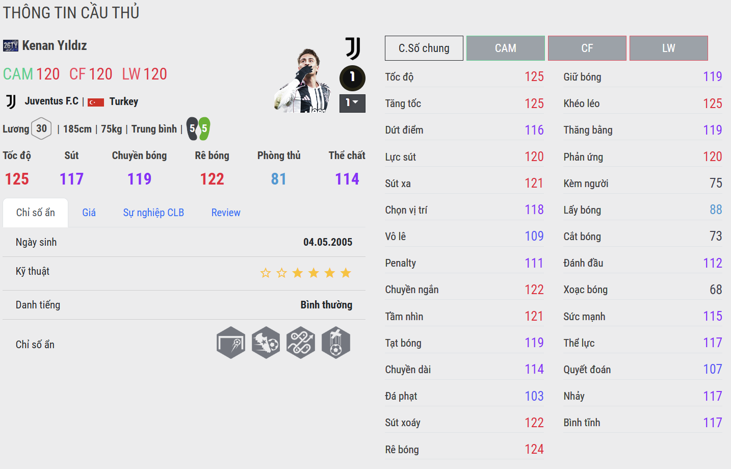 Kenan Yildiz 26TOTY là mẫu tiền vệ tấn công trẻ trung, giàu tốc độ và khả năng tạo đột biến cao. Yildiz có thể xử lý bóng khá linh hoạt, di chuyển năng nổ và tham gia trực tiếp vào các tình huống tấn công. Trong thực chiến, phiên bản này mang lại cảm giác chơi khá bùng nổ nhờ khả năng dứt điểm tốt và những pha bứt tốc ở khu vực trước vòng cấm.