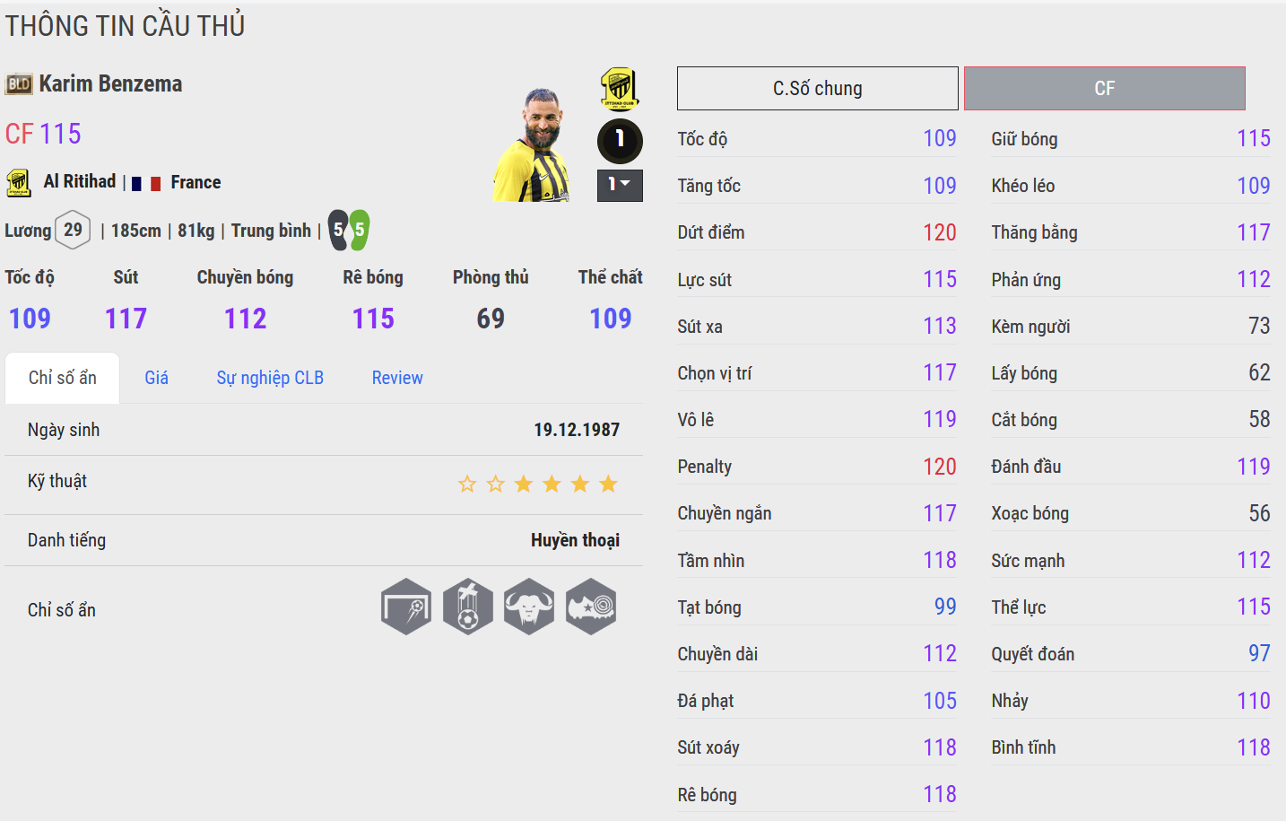 Karim Benzema BLD là mẫu CF hoàn hảo với khả năng làm tường và kết nối lối chơi. Benzema không chỉ ghi bàn mà còn hỗ trợ đồng đội bằng những pha phối hợp tinh tế. Khả năng giữ bóng, xoay sở và dứt điểm trong phạm vi hẹp giúp anh rất hiệu quả trong thực chiến.