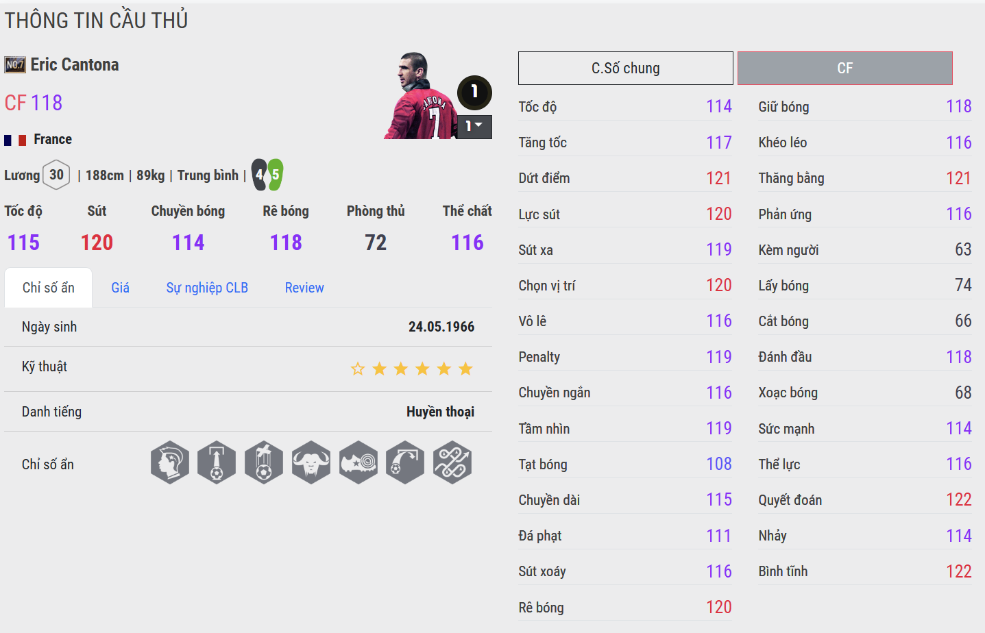 Eric Cantona No.7 mang đến phong cách chơi bóng đầy sức mạnh và cá tính. Cantona có thể tì đè, giữ bóng và tạo khoảng trống cho đồng đội, đồng thời sở hữu khả năng dứt điểm rất uy lực. Trong vai trò hộ công, anh là điểm tựa cực kỳ tốt cho hàng công.