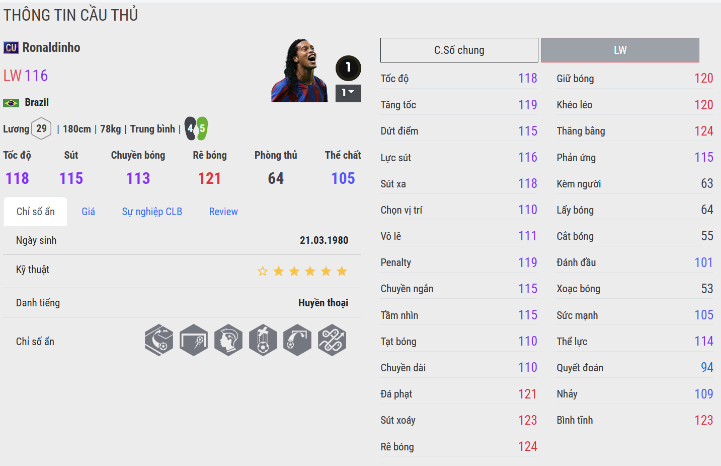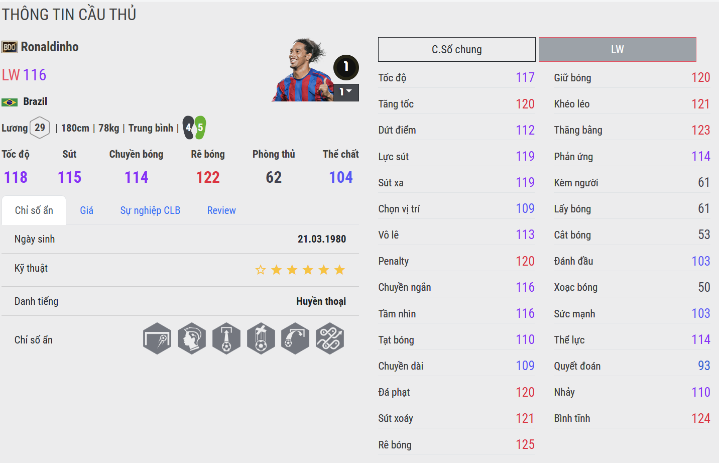 Ronaldinho là biểu tượng của bóng đá ngẫu hứng và nghệ thuật, một trong những cầu thủ hiếm hoi có thể biến mỗi pha chạm bóng thành một khoảnh khắc trình diễn. Trong màu áo FC Barcelona, anh không chỉ mang đến danh hiệu mà còn thổi vào sân cỏ thứ cảm xúc thuần túy của niềm vui chơi bóng.