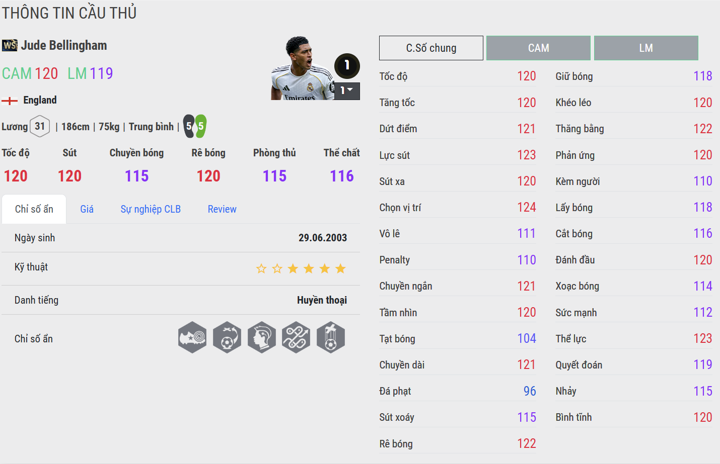 Tài năng trẻ người Anh thể hiện sự toàn diện khi vừa mạnh mẽ trong tranh chấp, vừa sắc bén trong tấn công. Bellingham WS là mẫu CAM hiện đại, cân bằng giữa công và thủ.