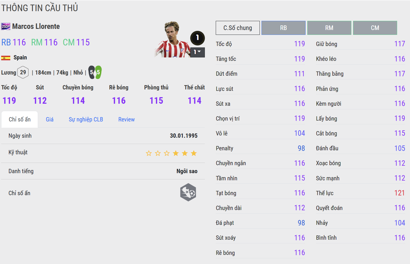 Một mẫu tiền vệ toàn năng hiếm có, Llorente 25DP mang đến sự cơ động và sức chiến đấu tuyệt vời nơi tuyến giữa. Anh có tốc độ ấn tượng, khả năng bao quát sân rộng và thể lực dồi dào giúp duy trì cường độ suốt 90 phút. Không chỉ phòng ngự chắc chắn, Llorente còn hỗ trợ tấn công tốt với những pha xâm nhập vòng cấm bất ngờ, tạo nên một phương án chuyển trạng thái cực nhanh trong tay người chơi.