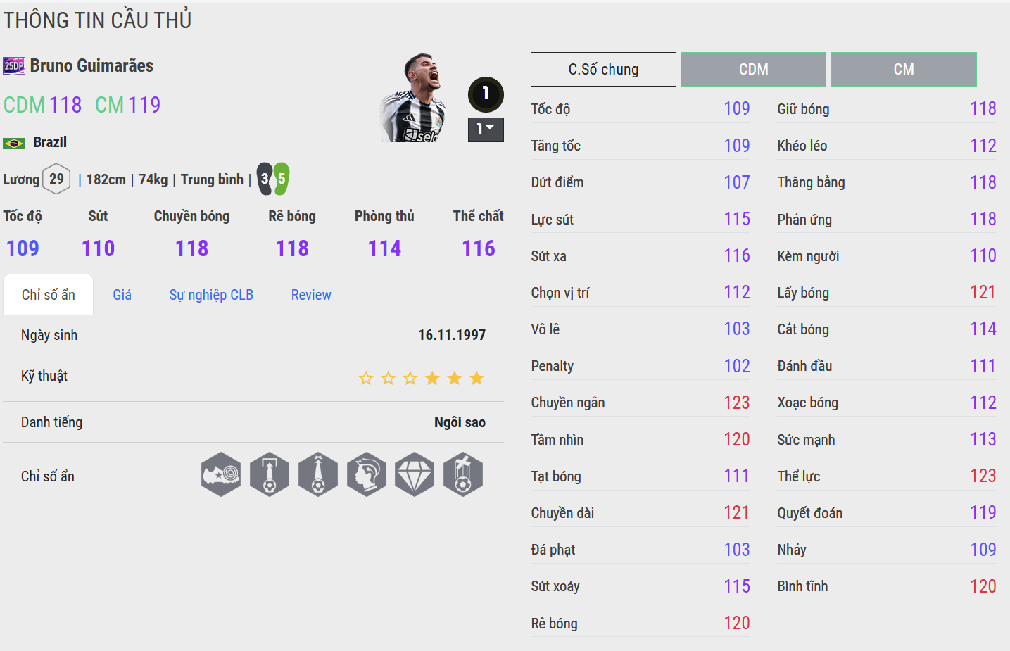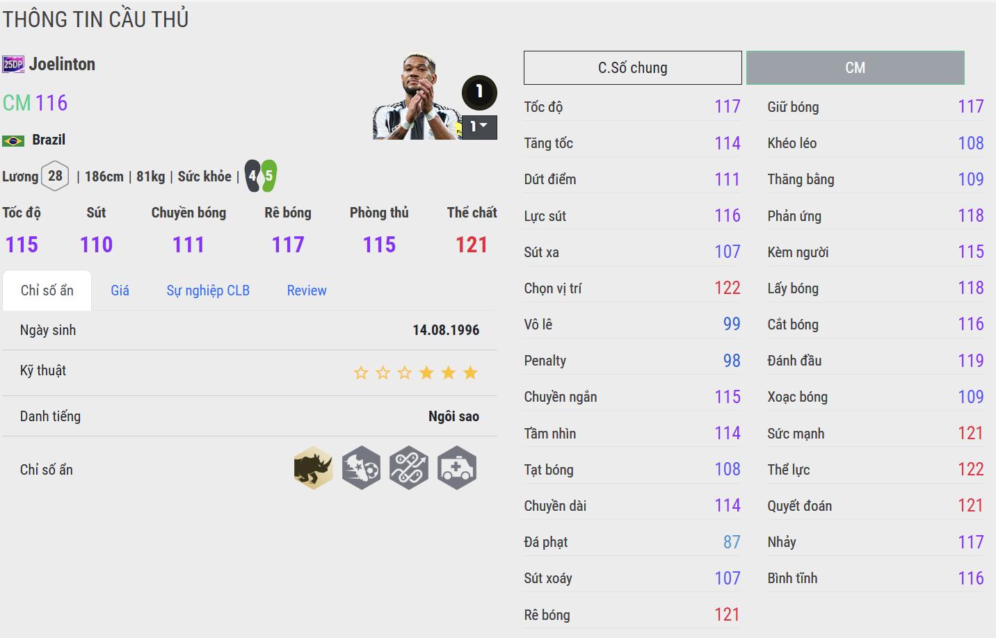 Joelinton là hình mẫu điển hình của sức mạnh và sự bền bỉ. Anh tì đè cực tốt, đọc tình huống chuẩn xác và thường xuyên chiến thắng trong các pha tranh chấp tay đôi. Dù xuất thân là một tiền đạo, nhưng khả năng kiểm soát bóng và chuyền ngắn của Joelinton giúp anh trở thành một mỏ neo đáng tin cậy trong vai trò CDM. Với Joelinton, người chơi có thể yên tâm về sự chắc chắn và độ ổn định nơi trung tuyến.