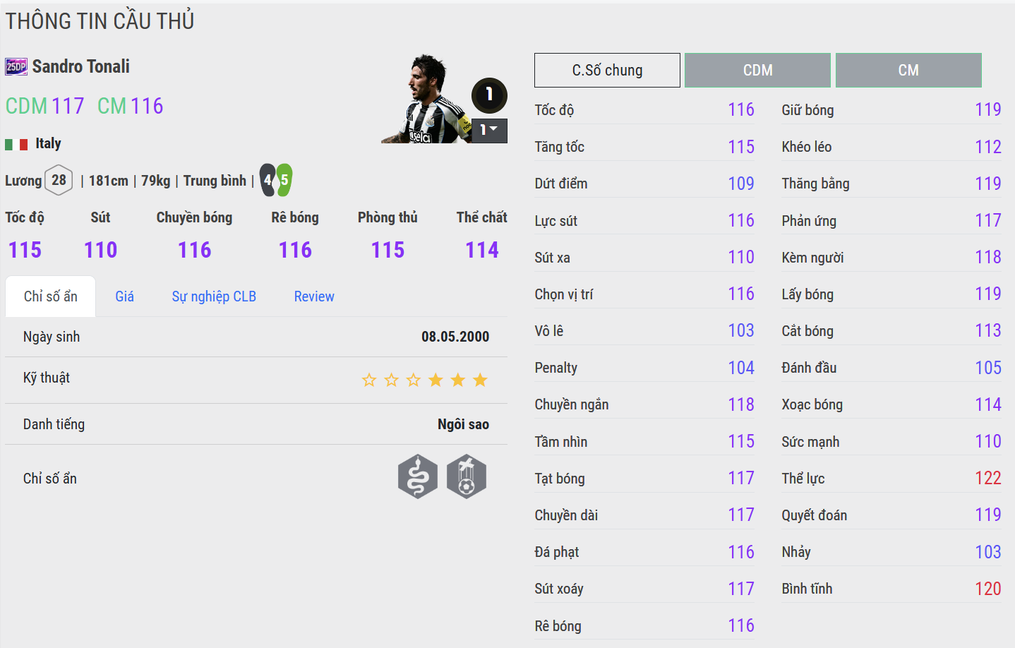 Tonali 25DP là mẫu tiền vệ phòng ngự có thiên hướng tổ chức và điều tiết nhịp độ. Anh không chỉ mạnh mẽ trong tranh chấp mà còn có tư duy chuyền bóng sắc sảo, giúp mở ra những đường phản công chớp nhoáng. Lối chơi của Tonali kết hợp hoàn hảo giữa sự kỷ luật chiến thuật và cái đầu lạnh, khiến anh trở thành lựa chọn lý tưởng cho những đội hình đề cao khả năng kiểm soát bóng và pressing tầm cao.