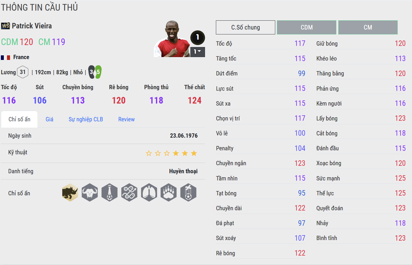 Vieira WS là mẫu tiền vệ phòng ngự có sức mạnh, thể hình và uy lực tranh chấp hiếm thấy. Anh tỏ ra xuất sắc ở các pha tay đôi, tì đè và phá bóng quyết liệt — cực kỳ phù hợp cho vai trò “máy quét” trước hàng hậu vệ. Trong gameplay, Vieira rất hiệu quả khi đá hộ công kiêm phòng ngự (box-to-box nhẹ): bạn có thể cho anh quyền xông lên hỗ trợ tấn công nhưng vẫn cần 1 đối tác giữ vị trí sâu để bù đắp.