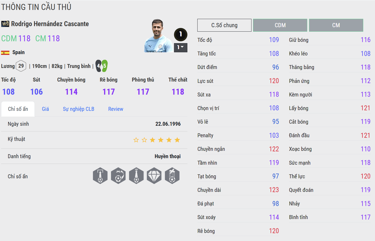 Rodri WS là tiền vệ hiện đại: chọn vị trí siêu thông minh, đọc trận tốt và chuyền ngắn cực ổn để duy trì nhịp. Điểm mạnh của anh là phân phối bóng an toàn, cắt đường chuyền đối phương và thiết lập các pha lên bóng từ tuyến dưới. Dùng Rodri khi bạn muốn kiểm soát bóng, triển khai từ dưới — kết hợp với một tiền vệ cơ động bên cạnh để che chắn cho anh khi cần.