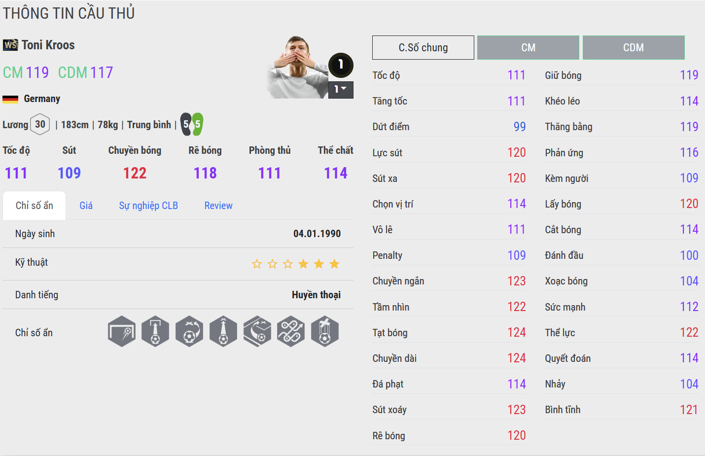 Kroos WS là biểu tượng của việc điều tiết trận đấu: chuyền ngắn, chuyền dài, phất bóng mở biên và giữ nhịp là sở trường. Anh không nổi trội về thể lực hay tì đè nhưng bù lại có độ chính xác chuyền và nhãn quan tạo đột biến từ tuyến hai. Trong gameplay, Kroos tỏa sáng khi được đặt lùi sâu, giữ vai trò phát động; hãy bảo kê cho anh bằng một “máy quét” cơ bắp để Kroos tập trung làm nhiệm vụ sáng tạo.