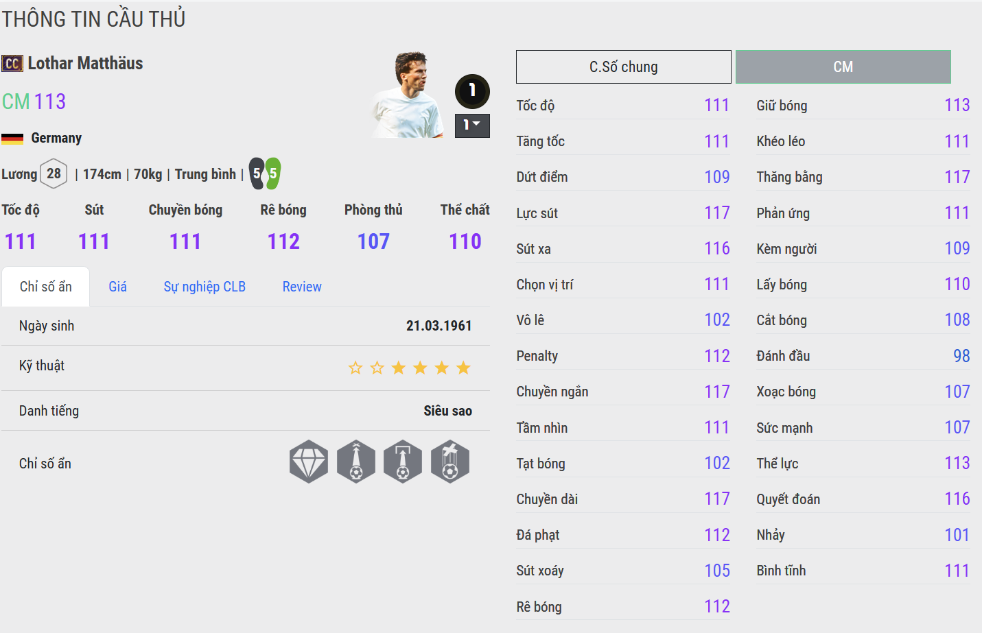 Matthäus CC là CDM toàn diện và đáng tin cậy nhất. Anh kết hợp hoàn hảo giữa sức mạnh, tốc độ, khả năng cắt bóng và kỹ năng chuyền bóng chuẩn xác. Trong gameplay, Matthäus không chỉ đánh chặn xuất sắc mà còn có thể tung ra những cú sút xa uy lực, trở thành “trái tim” thực thụ nơi hàng tiền vệ.