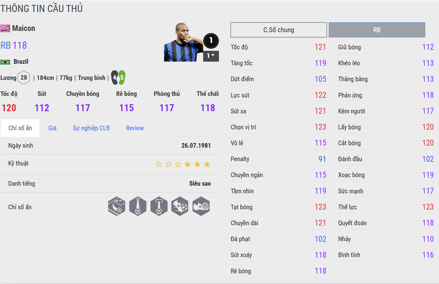 Maicon 25HR mang đến làn gió mới cho vị trí CDM trong meta hiện tại. Anh sở hữu nền tảng thể lực dồi dào, tốc độ tốt và khả năng tranh chấp mạnh mẽ. Điểm đáng chú ý là Maicon có xu hướng dâng cao hỗ trợ tấn công, tạo ra sự bất ngờ trong các pha chuyển trạng thái – một mẫu CDM hiện đại, giàu năng lượng và hiệu quả.