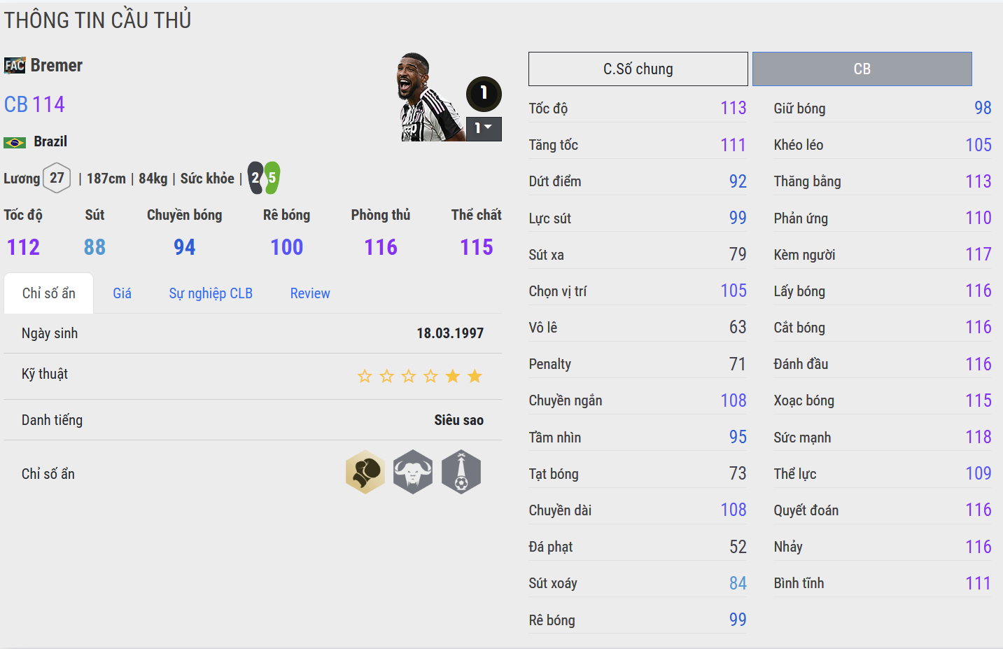 Bremer FAC mang đến cảm giác của một trung vệ “cơ bắp – thực dụng – ổn định”. Anh sở hữu khả năng tì đè mạnh, tranh chấp trực diện hiệu quả và luôn giữ được sự chủ động trong những pha đối đầu 1v1. Điểm mạnh của Bremer nằm ở sức mạnh nền tảng và khả năng che chắn khôn ngoan, giúp anh xử lý tốt trước các mẫu tiền đạo thiên về tốc độ lẫn thể lực. Dù không phải kiểu trung vệ phát động tấn công quá nổi bật, Bremer vẫn là lựa chọn cực kỳ an toàn cho những người cần một CB chắc, khỏe và ít mắc sai lầm.